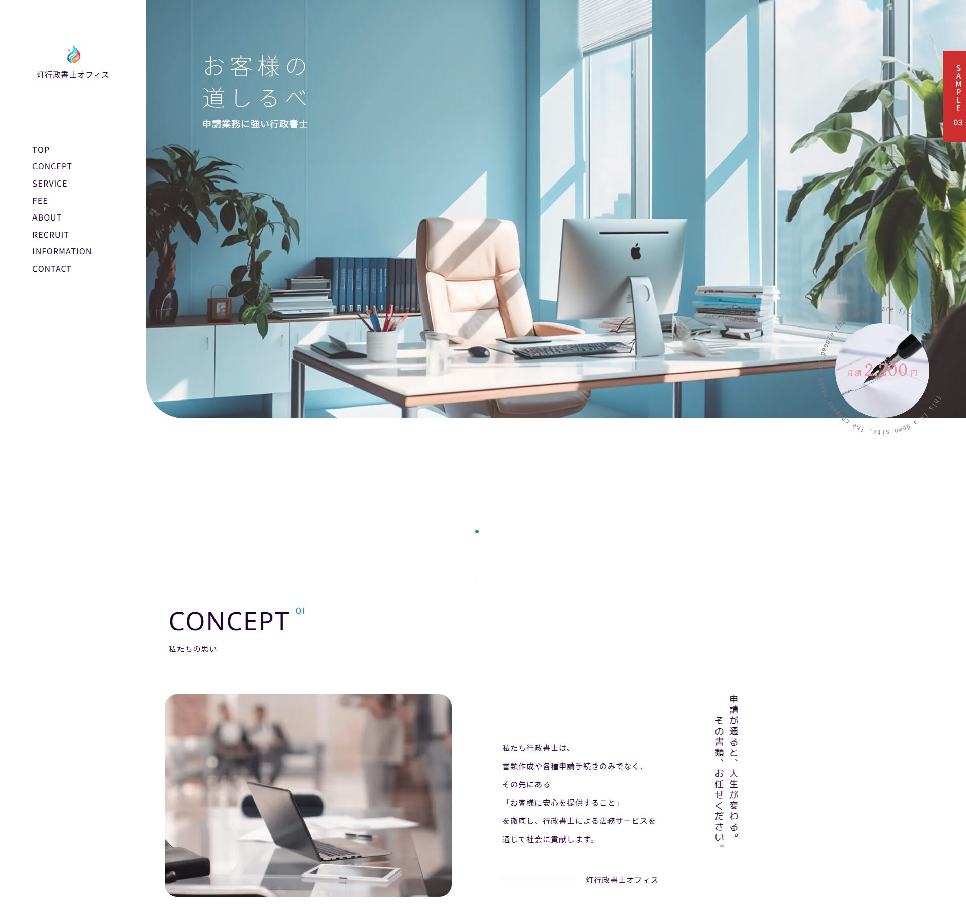 士業の方々の名刺代わりにもなるWebsiteとしてふさわしい安心感・信頼感をベースとして、細部にデザイン性を取り入れています。